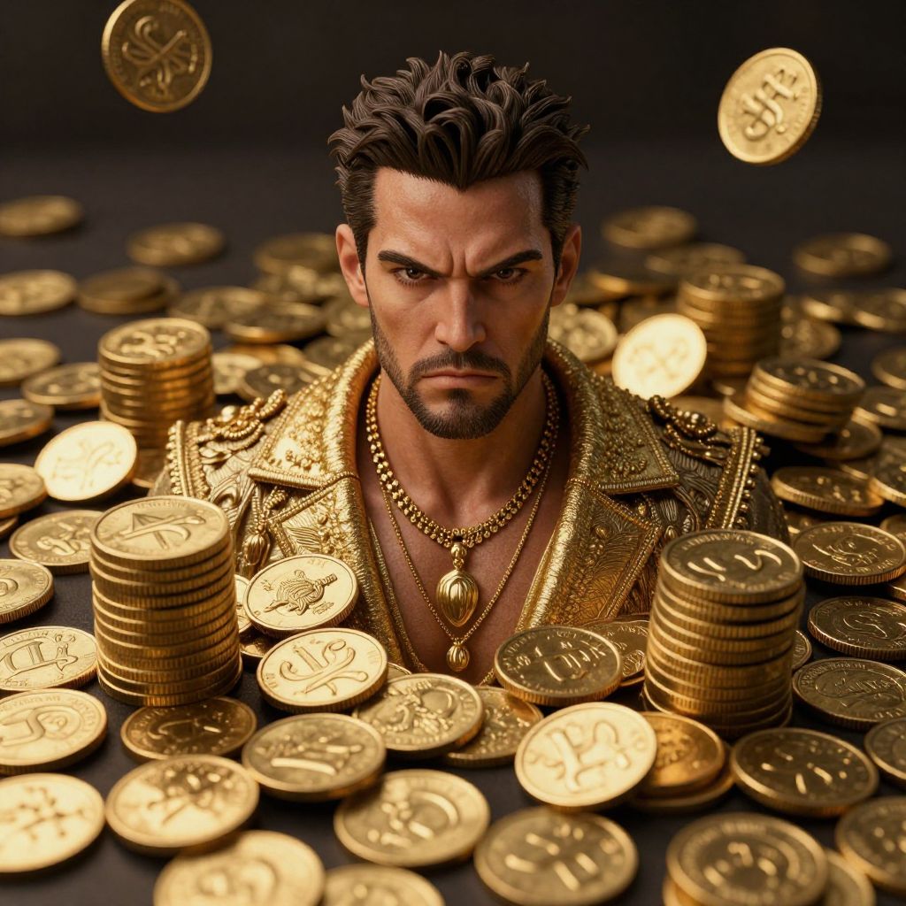 Photorealistic digital image of a handsome, dark-haired man with a trimmed beard and intense gaze, surrounded by numerous gold coins. He wears a glittering, ornate gold jacket with intricate patterns and a matching necklace with a round pendant. The coins are scattered around him, some stacked, others floating mid-air, creating a sense of wealth and opulence. The background is dark, making the gold coins and his jacket stand out vividly. The lighting highlights his muscular build and the luxurious textures of his attire and the coins.