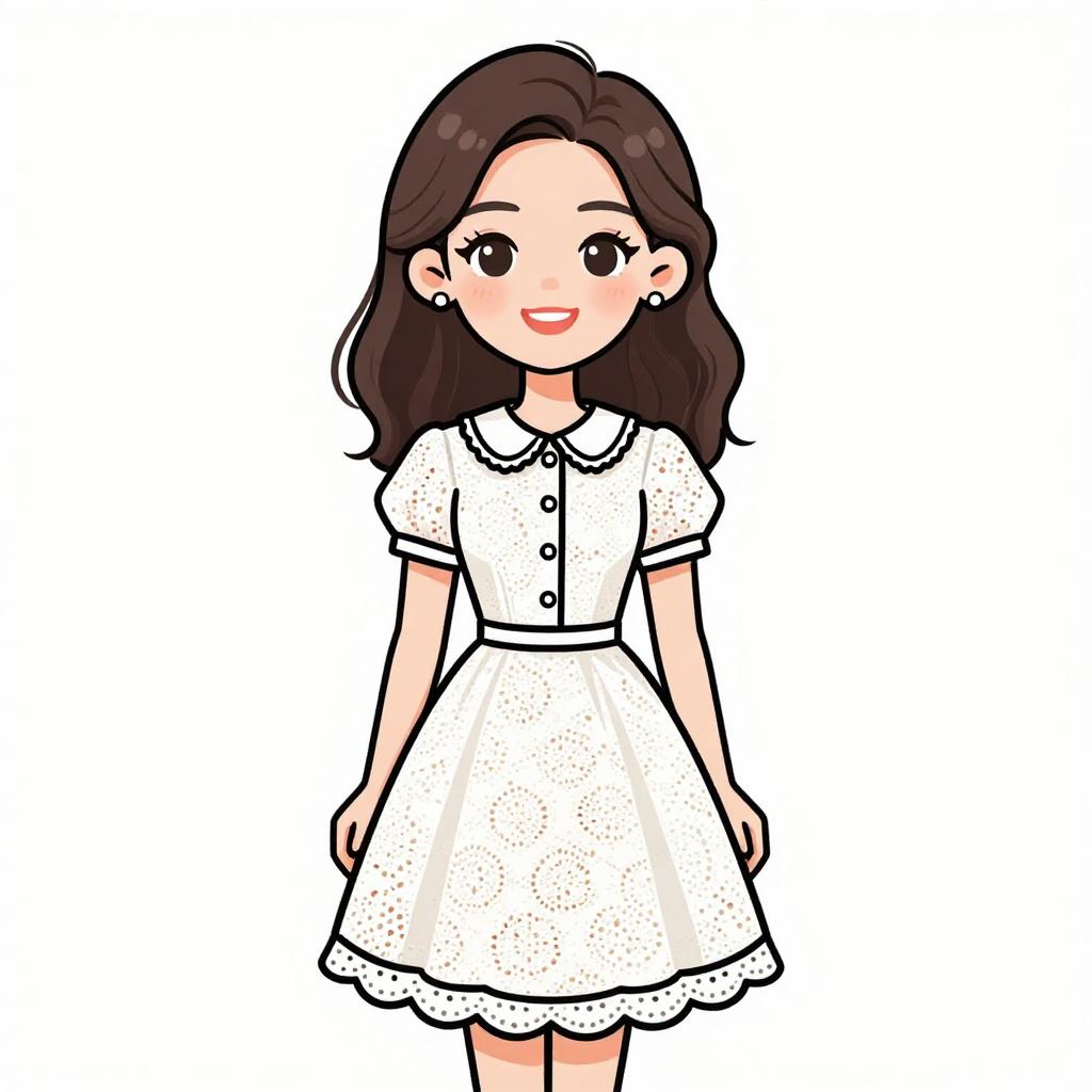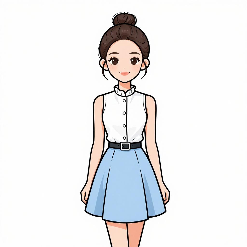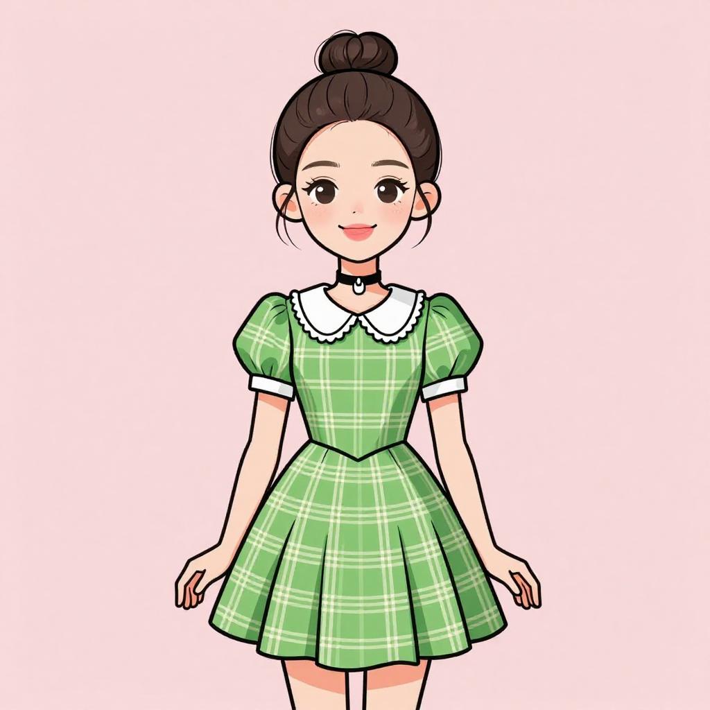 Woman with pretty face and pretty hair. smiling Woman, doll-like fashion, green plaid dress with short puffed sleeves and white cuffs, white flat collar with ruffled edge, fitted bodice, flared skirt above knee length, black choker with silver charm, pink lipstick, high bun hairstyle with stray tendrils, pale pink studio background. --sref 1467