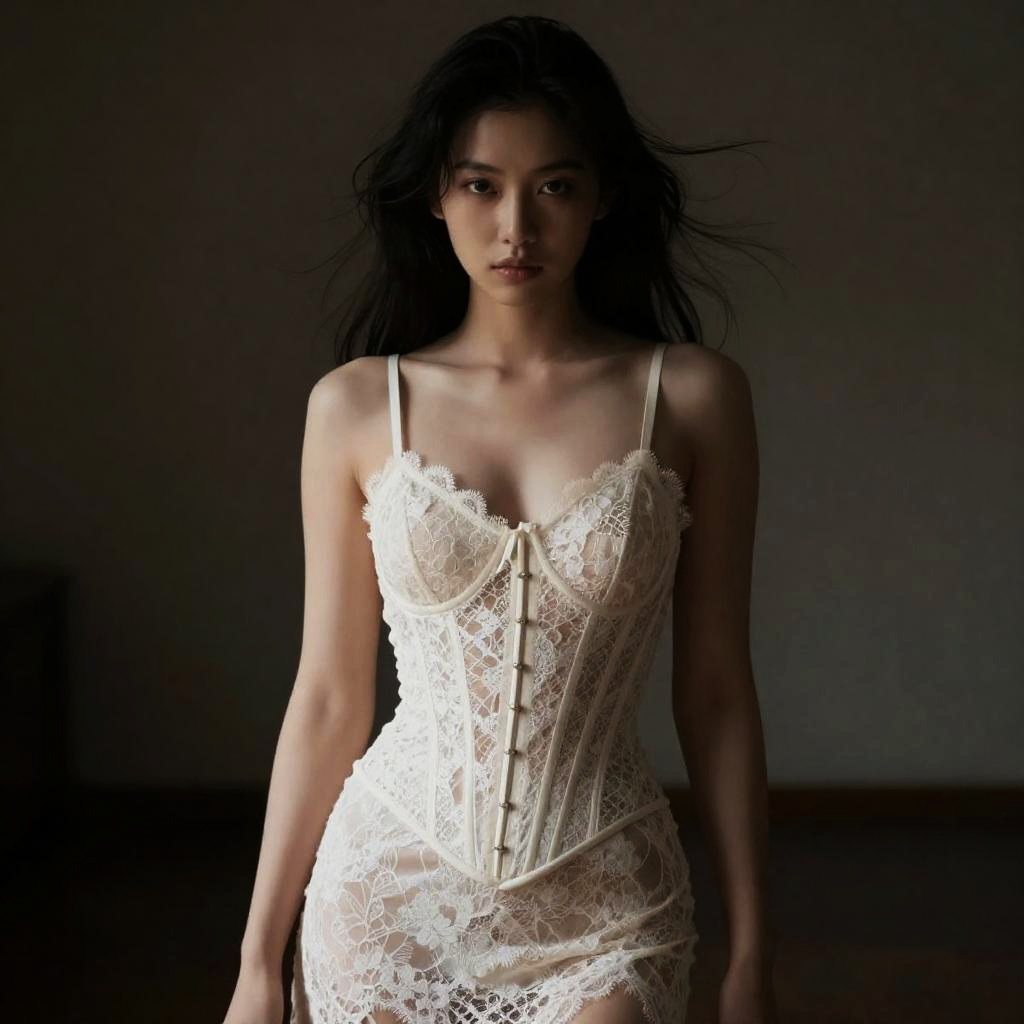 Disconnected Top Knot hairstyle on male model, wearing leather corset and tulle skirt, in industrial warehouse, captured in fashion editorial style with harsh spotlight with shadows.