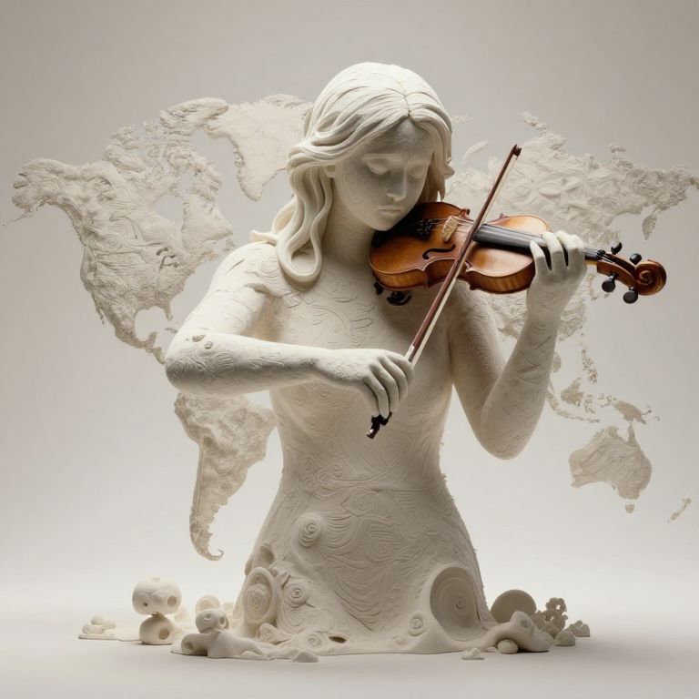 A photograph of a white, intricately carved marble statue of a young woman playing a violin. She has long, flowing hair and a serene expression, with detailed textures on her dress and skin. Behind her, a ghostly, abstract world map adds a surreal element. At her feet, small, carved animal figures, including a mouse, enhance the scene. The statue is illuminated from behind, creating a soft, ethereal glow. The background is a smooth, gradient gray, highlighting the statue's detailed craftsmanship.