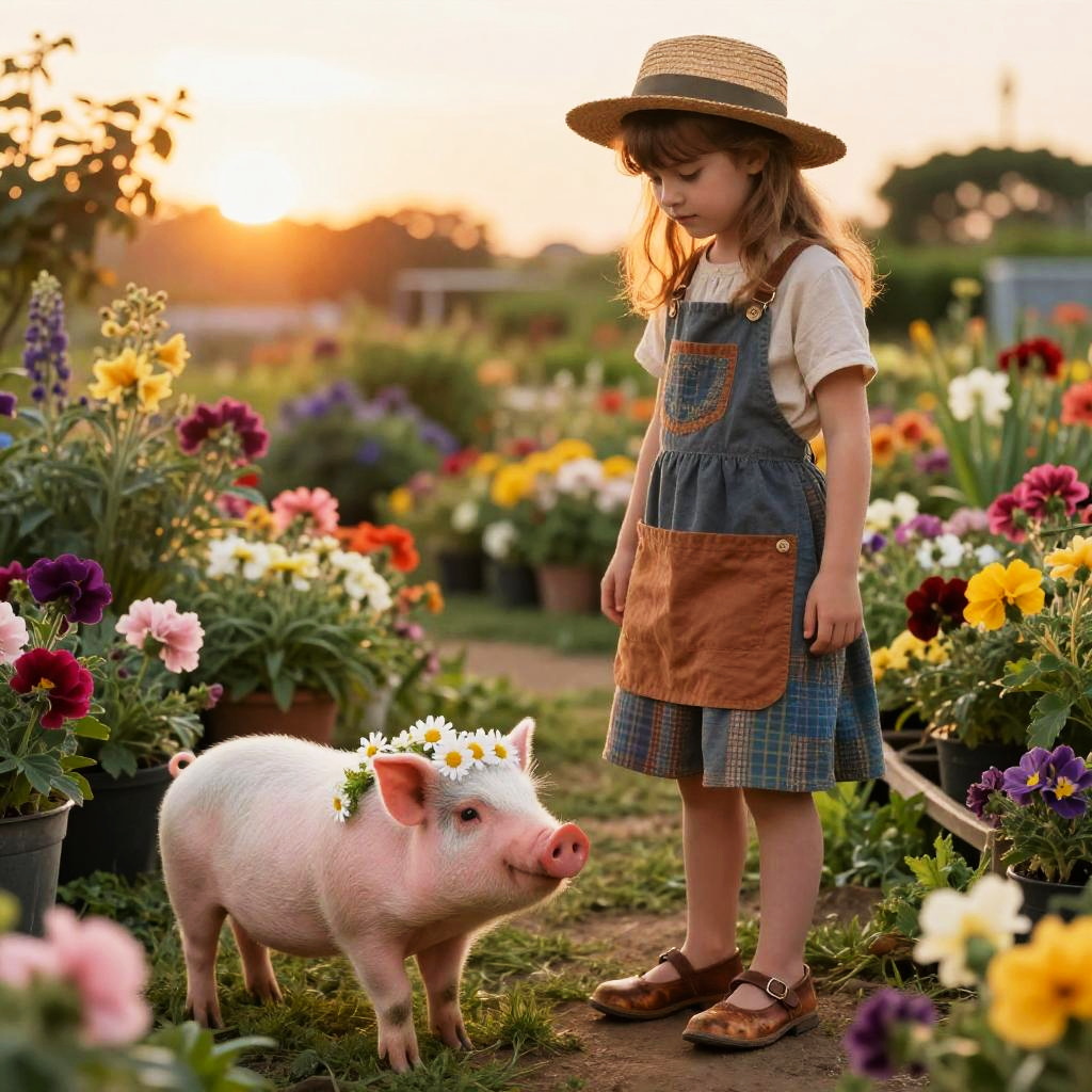 A young florist in a patchwork apron dress and straw hat wearing worn brown leather Mary Janes explores a vibrant garden filled with colorful flowers at sunset. A playful miniature pot-bellied pig with a daisy garland accompanies her, adding charm to the scene.