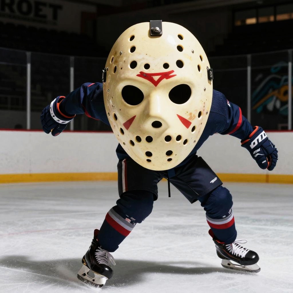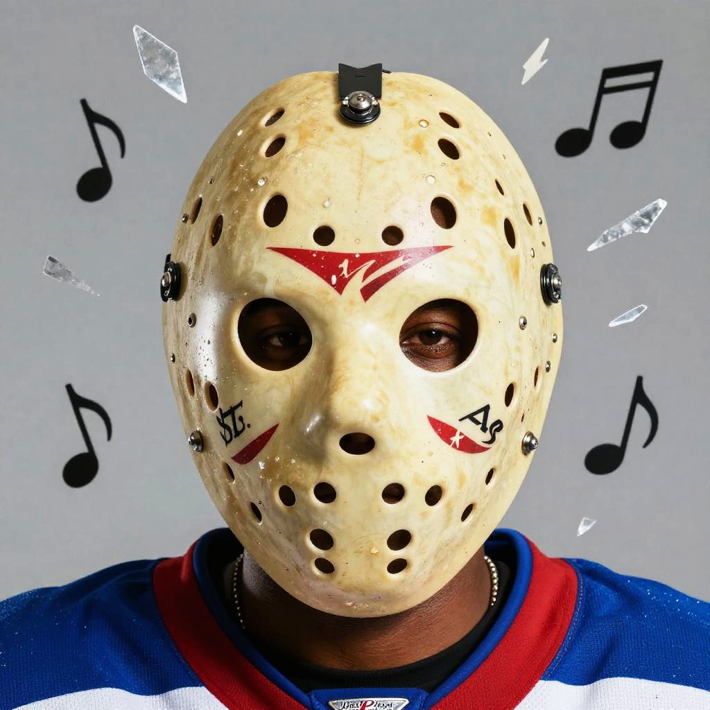 Kanye West hockey mask, surreal mix of music and sports themes, Kanye in a vintage hockey mask surrounded by floating musical notes and ice shards, vibrant color palette
