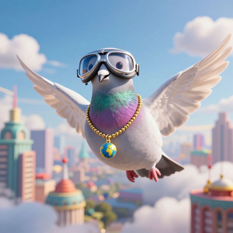 A whimsical 3D-rendered pigeon dons aviator goggles and a gold necklace with a miniature globe pendant, soaring through the clouds as if exploring fantastical, impossible cities in a vibrant, high-definition digital art style.