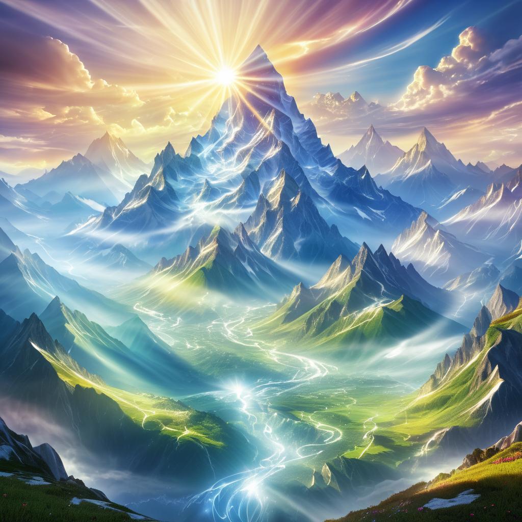 A highly detailed fantasy scene depicting a majestic mountain range with sharp peaks and swirling clouds. The radiant sunbeams illuminate the landscape, enhancing a magical atmosphere. Flowing rivers and waterfalls cascade through green valleys adorned with colorful flowers and pine trees, creating a vibrant and enchanting panorama.