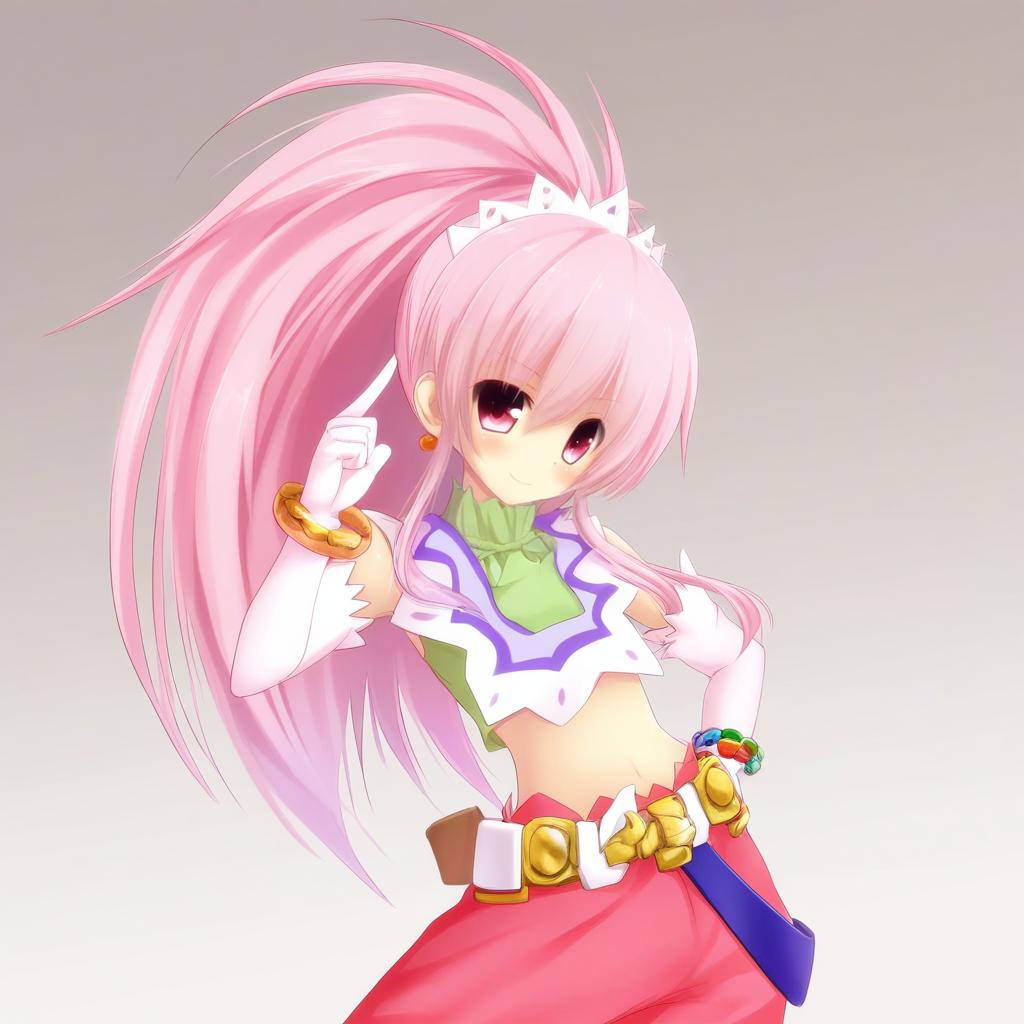 Arche klein, tales of (series), 1girl, pink eyes, pink hair, long hair, ponytail, wide ponytail, elbow gloves, pink pants, belt, earrings, bracelet, by artist syroh, leet