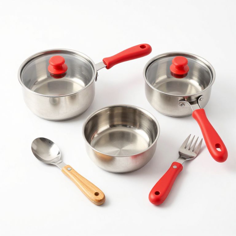 Kidkraft's vibrant play set features three stainless steel pots and pans with red handles and lids, accompanied by a wooden-handled spoon and a red-handled fork, all neatly arranged on a clean white surface.