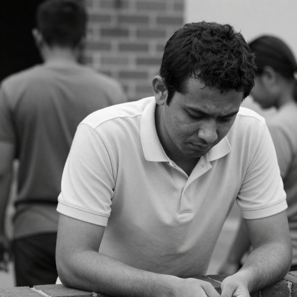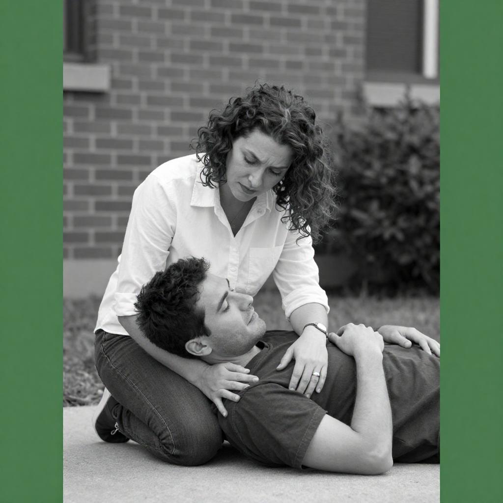 Black and white photograph of a woman with medium-length curly hair, wearing a white shirt, kneeling behind a man lying on the ground, hugging him. Man has short hair, wearing a dark shirt and pants. Background includes a brick building and shrubs. Green border on the left and right. Woman's facial expression is caring.