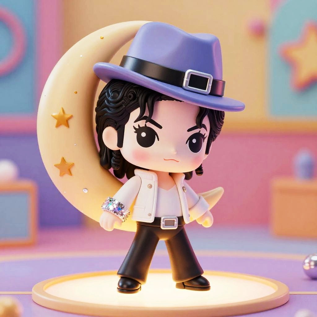Michael jackson chibi figure moonwalking on a glowing dance floor, tiny animated style, soft pastel colors, detailed facial expressions, sparkly glove and fedora hat, vibrant pop art background