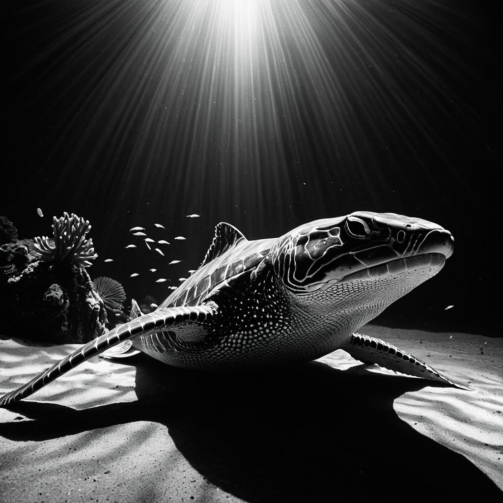 Highly detailed digital art of an underwater male lizard wearing a crown, depicted as a king. The image features intricate scales and textures on the reptile's skin, with a majestic crown sitting atop its head. The lizard is surrounded by an aquatic environment with blurred fish and coral in the background, creating a mystical underwater scene.