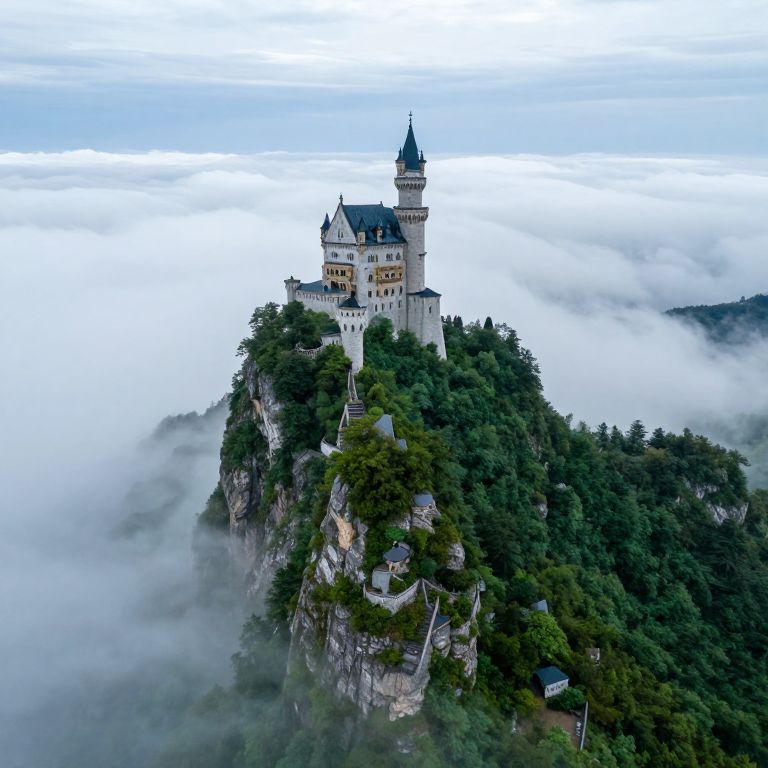 A majestic, emerald-green mountain pierces the endless sea of clouds, crowned by a grand, medieval castle that defies gravity, standing serenely above the ethereal landscape.