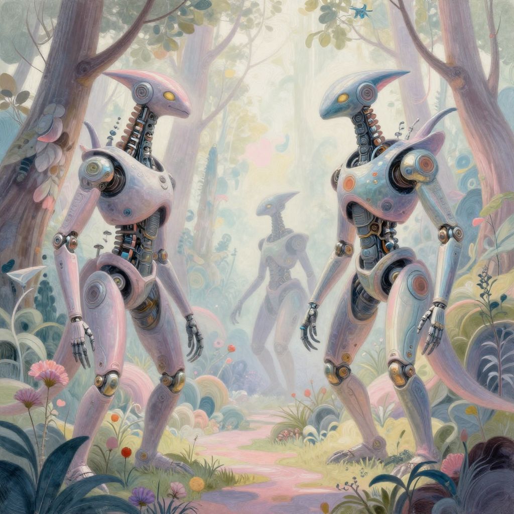 AI art drawing depicting a dreamlike forest inhabited by biomechanical creatures, soft pastel palette mixed with sharp metallic details, intricate shading and imaginative design conveying a mystical and futuristic atmosphere.
