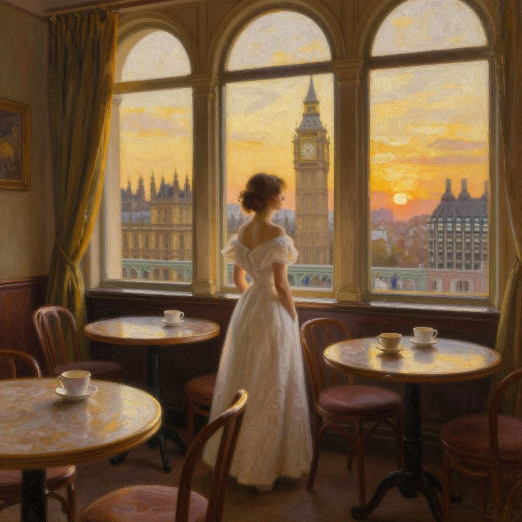 Impassioned matte painting from an old Street of London, Big Ben in the Background, style in an old Rembrand Oil painting,