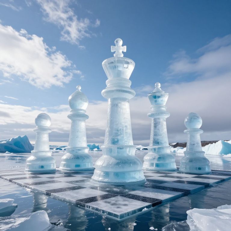 Photograph of a chessboard set in a frozen landscape. The chess pieces are made of translucent, blue-tinted ice, with the king prominently positioned in the center. The board's squares are black and white, partially submerged in ice. The background features a bright blue sky with scattered white clouds, and ice formations are visible in the distance. The image has a high-contrast, surreal quality, emphasizing the icy textures and reflections. The scene evokes a sense of cold, calm, and stillness.
