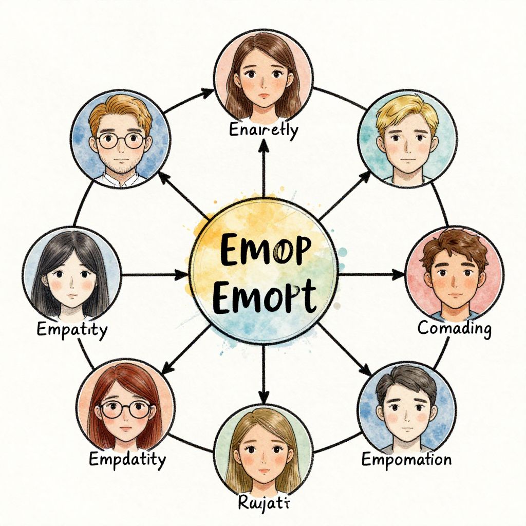 A character trait web diagram illustrating human emotions and qualities, using artistic hand-drawn sketches and watercolor textures, featuring interconnected nodes representing traits such as empathy, determination, and honesty, set against a light, textured backdrop.