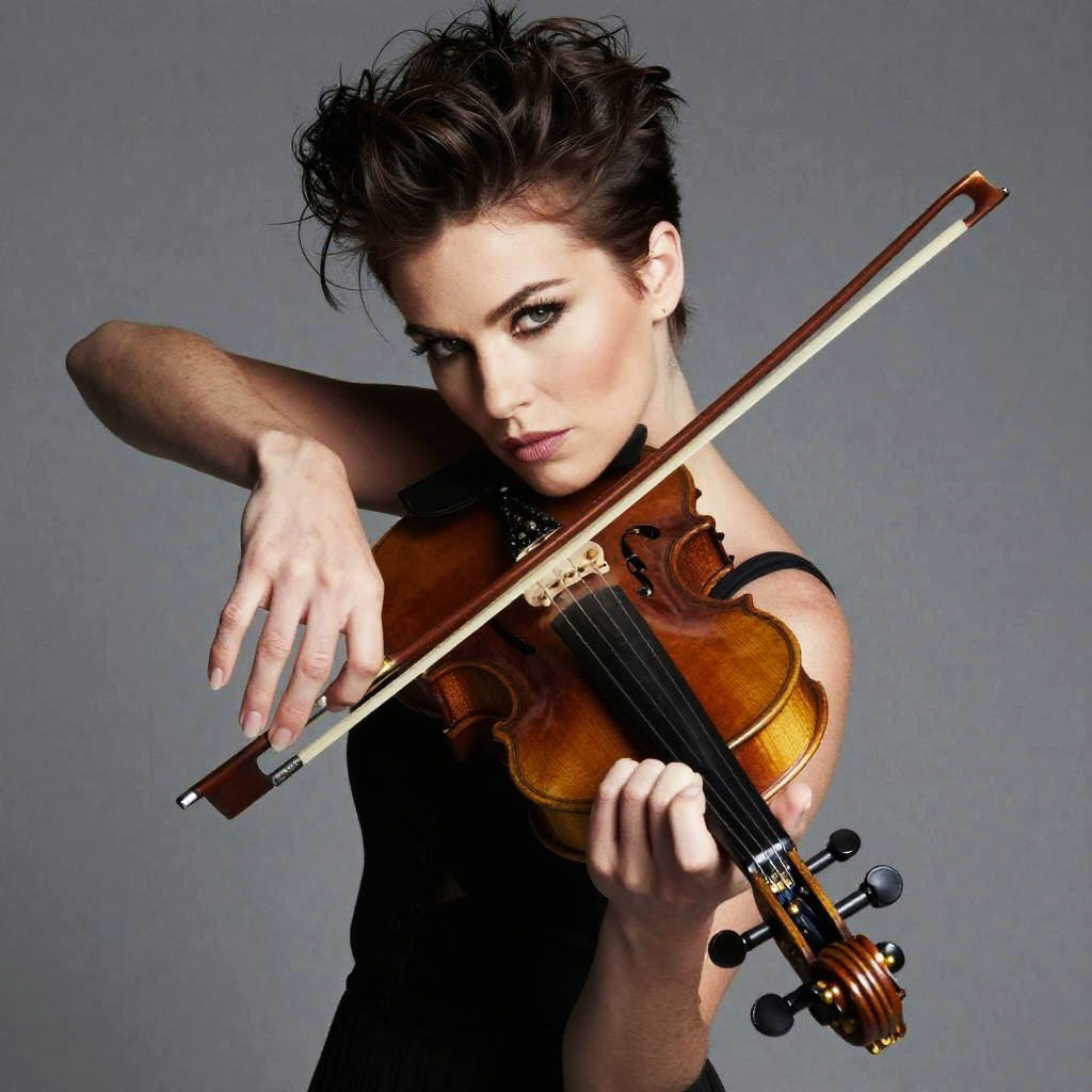 Portrait of a violinist in a poised, intense pose, intricate details with volumetric lighting. Inspired by Annie Leibovitz's fashion photography, no background, highly detailed face, shot on Nikon DSLR, f/1.8, award-winning style