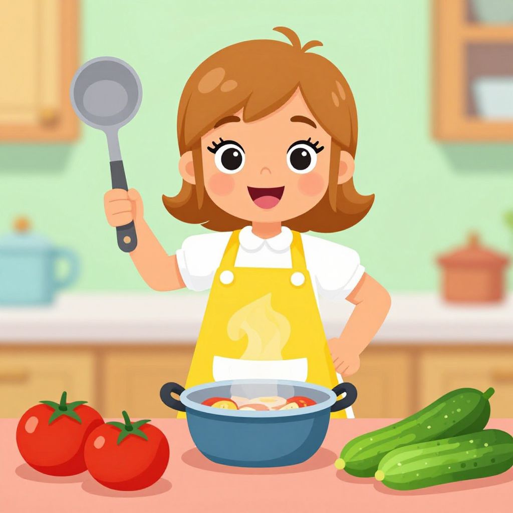Cartoon illustration of a smiling brown-haired girl in yellow apron, holding a spatula, surrounded by tomatoes and a cucumber.