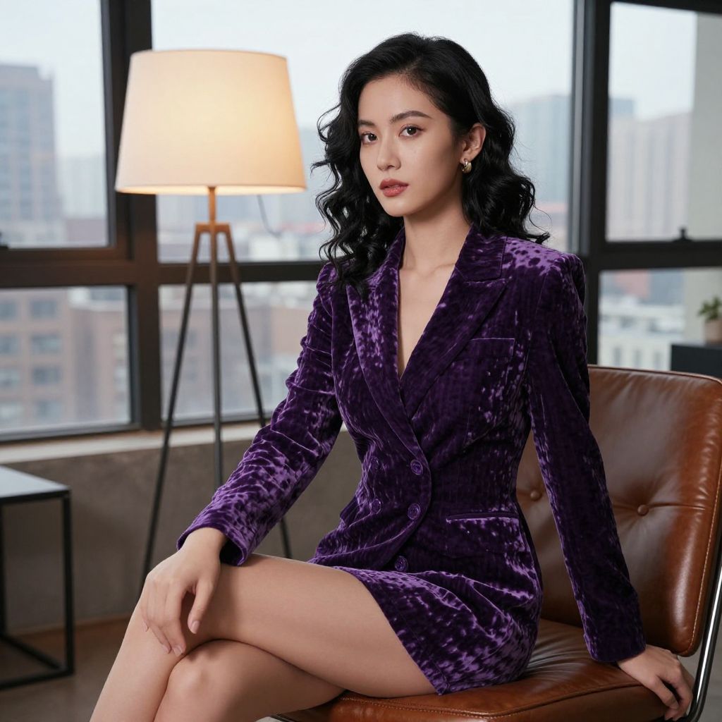 A stylish woman in her late 20s with wavy black hair and a thoughtful expression sits on a leather chair inside a cozy urban loft, wearing a sophisticated purple velvet jacket with a classic tailored cut, the jacket reflecting ambient light from a floor lamp, with city skyline views visible through large windows in the background.