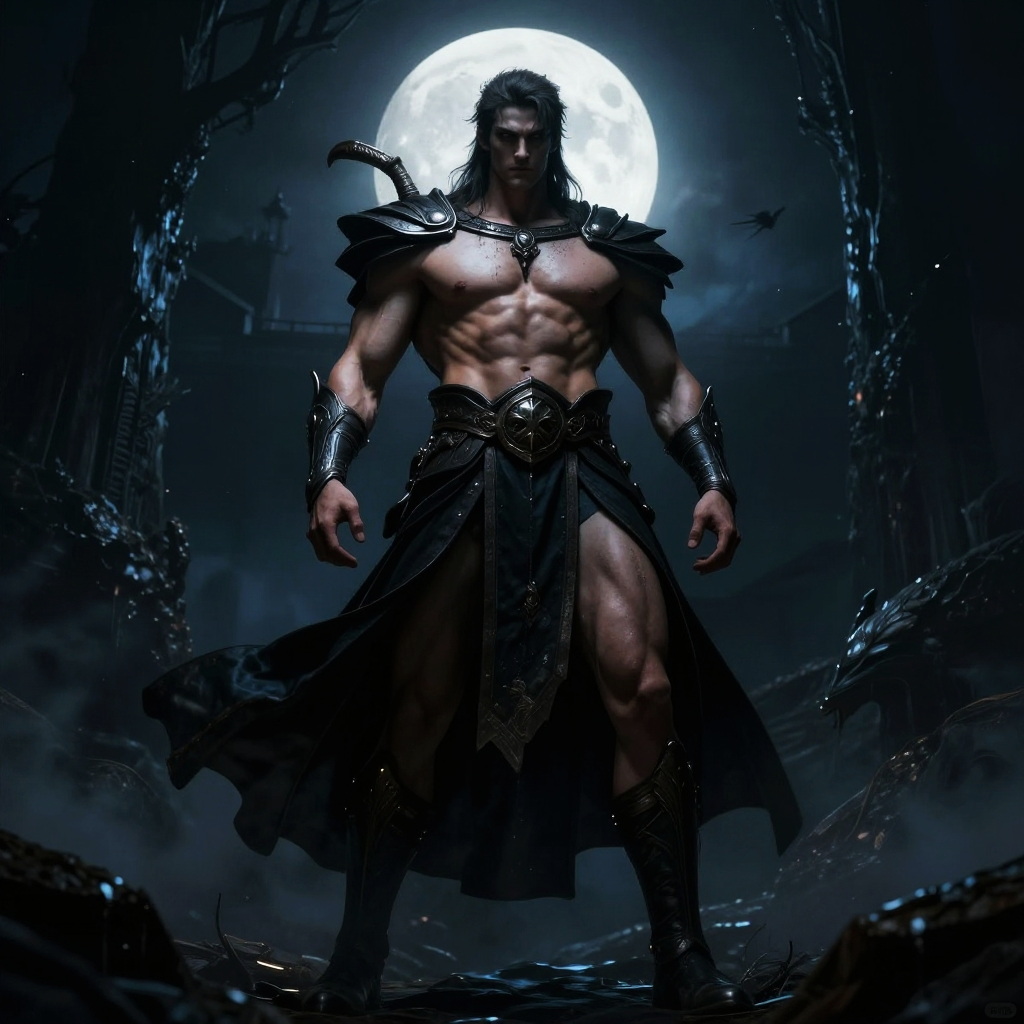 This striking artwork depicts a powerful male figure standing confidently amidst an otherworldly scene. His muscular physique and dramatic attire convey a sense of strength and mystique, enhanced by the dark, fantasy elements surrounding him and the full moon in the background.