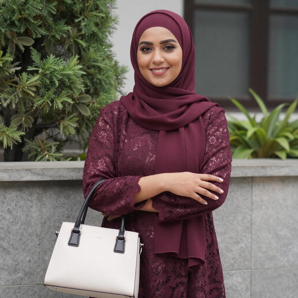 Photograph of a young woman with light brown skin and dark eyes, wearing a purple hijab, bright pink jacket, and brown pants. She holds a white purse and a smartphone, standing against a weathered, graffiti-covered wall with a red railing. Her expression is calm, and she gazes slightly to the side.