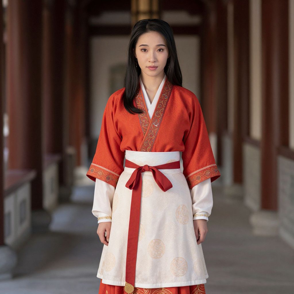 Photograph of an Asian woman with straight black hair standing indoors in a traditional Korean setting. She wears a vibrant red silk kimono with intricate gold embroidery on the sleeves and a white apron-style skirt tied with a red ribbon at the waist. The background shows a corridor with wooden pillars and stone bases, creating a warm, rustic atmosphere. Her expression is calm and composed, and she stands centered in the frame, facing the camera. The lighting is natural, highlighting the rich colors and textures of her attire.