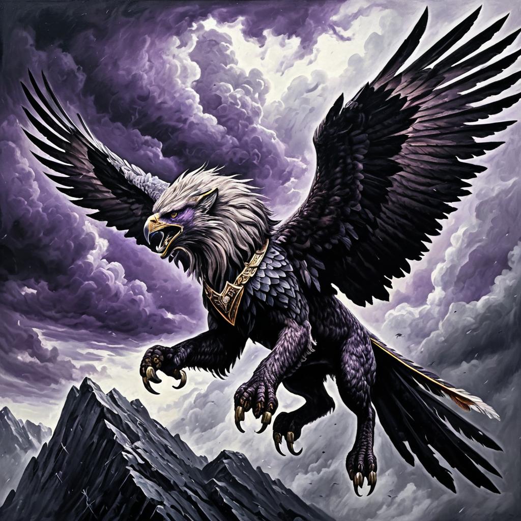 Detailed oil painting of a majestic griffin with a lion's body and eagle's head, flying amidst stormy violet and gray clouds. The image features rich, textured brush strokes and dramatic overcast lighting, inspired by Warhammer fantasy RPG art style.