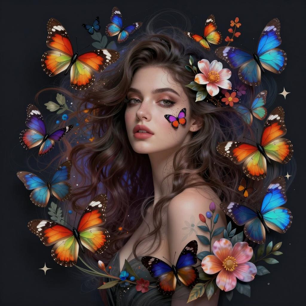 This stunning artwork features a woman adorned in a black, ethereal gown, surrounded by vibrant blue butterflies. The intricate details of the dress, combined with the dreamy background, create a sense of movement and serene beauty. The piece evokes a whimsical yet haunting atmosphere, showcasing a blend of realism and fantasy.