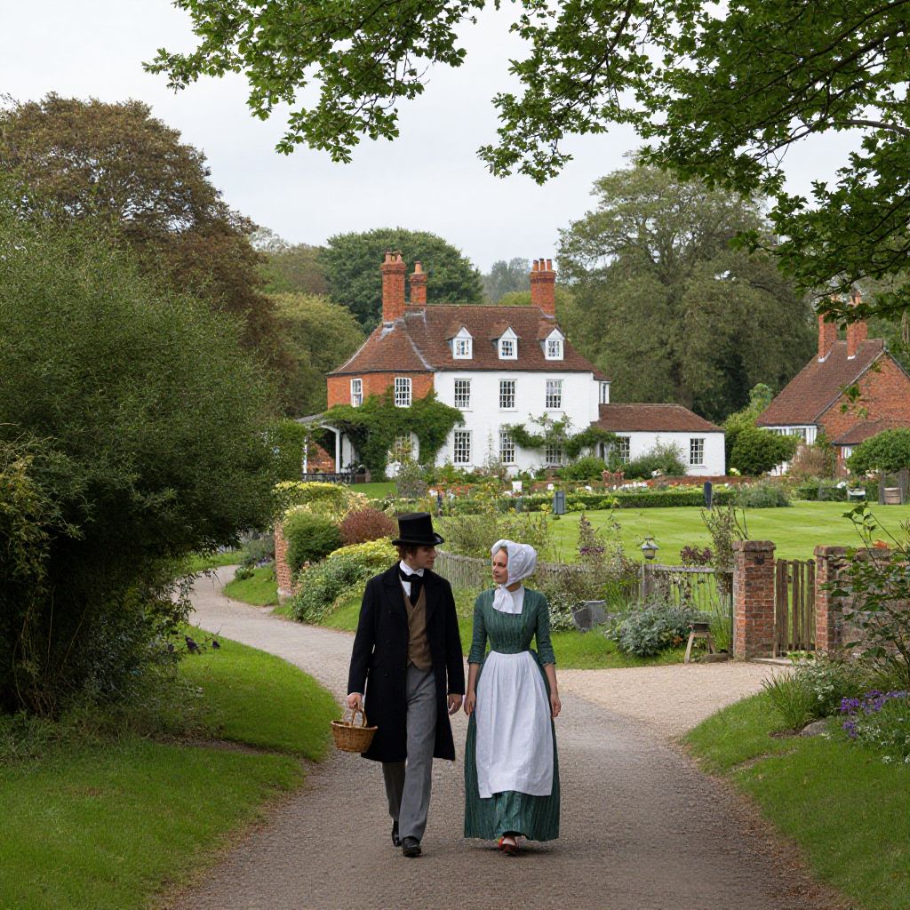 The image depicts a serene, regency-era scene in an English village, reminiscent of the style of Edmund Blair Leighton and John Constable. A couple, dressed in period attire, walks down a winding lane, their figures framed by lush greenery and a picturesque house in the background. The man wears a top hat and a long coat, while the woman dons a green dress with a white apron and a bonnet. They carry a basket, suggesting they might be on a leisurely stroll or perhaps returning from a visit. The house, with its red brick chimneys and white walls, stands majestically in the distance, surrounded by well-manicured gardens and trees. The overall composition is balanced, with the couple positioned centrally, leading the viewer's eye towards the house and the expansive landscape beyond. The scene is bathed in soft, natural light, enhancing the tranquil and idyllic atmosphere of this timeless moment.