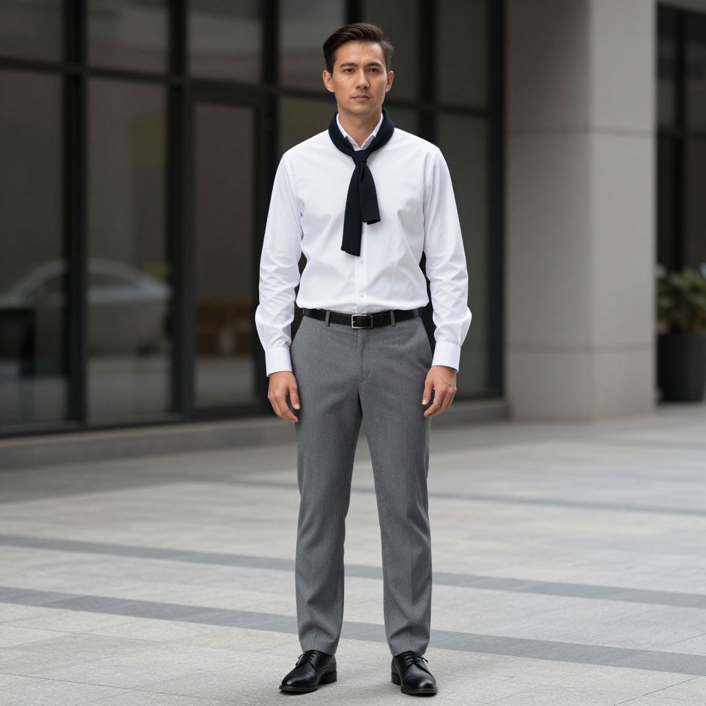 Smart Business Casual Costume, man in a white shirt and gray pants with a black scarf