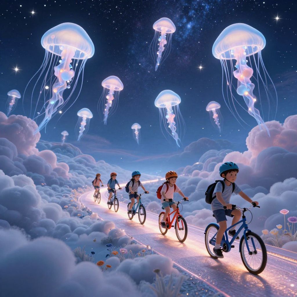 Children pedal bicycles along a luminous path through a dreamy sky filled with glowing jellyfish, their ethereal lights illuminating a surreal landscape of clouds and celestial wonder.