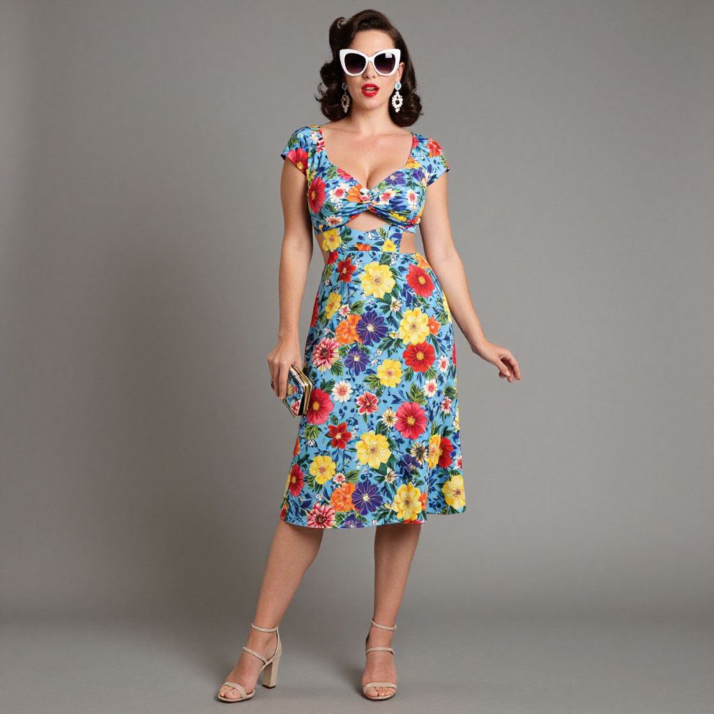 Full body shot, Hourglass woman, vintage-inspired cut-out dress, fitted bodice, flared skirt, bold floral print, lightweight cotton fabric, deep V-neckline, cap sleeves, cinched waist, playful side cut-outs, knee-length hem, paired with strappy block heels, matching clutch bag, oversized sunglasses, retro hairstyle, bright red lipstick, statement earrings, playful and chic vibe Sexy. Pretty face and beаutiful eyes. Big breasts