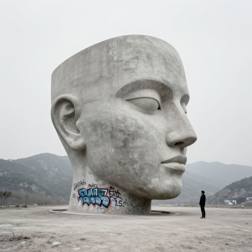 A photo of a (surrealistic human-faced building:1.3), (concrete curvature:1.2), ((colorful graffiti1.5)), against a mountain landscape, with a (lone observer:1.1), (profile contemplation:1.1), architectural wonder, minimalist palette, Nikon Z7, 1/500s, f/8, ISO 64, spatial oddity, thought-provoking scale, juxtaposition of form, RAW format, philosophical dimensions, muted tones, expansive negative space, stark composition.
