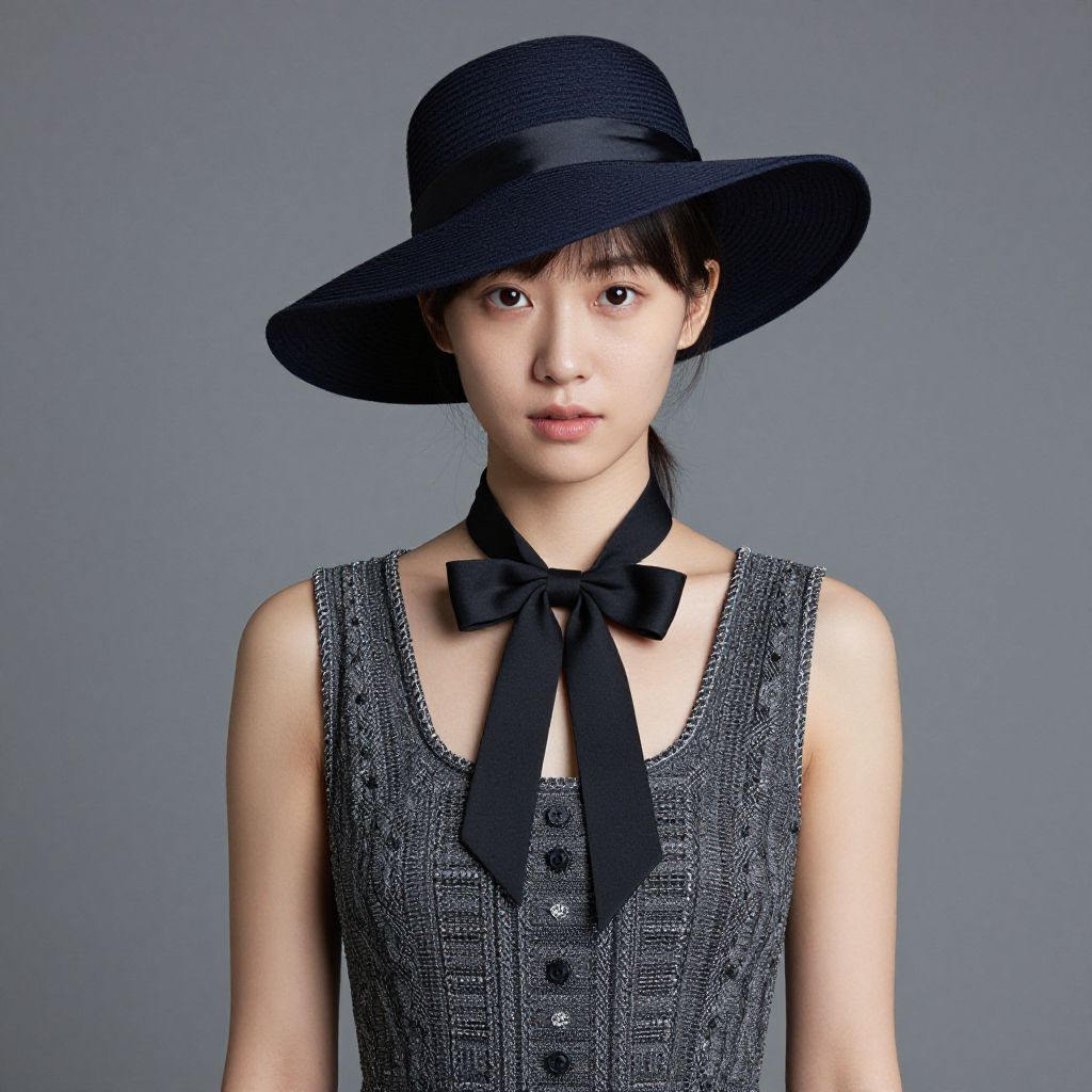 Photograph of an East Asian woman with light skin and black hair, wearing a large, black, wide-brimmed hat with a satin ribbon. She has a neutral expression and is dressed in a sleeveless, gray, textured, patterned dress with a black bow tied around her neck. The background is a solid, muted gray. The hat's brim casts a slight shadow on her face, adding depth. Her makeup is minimal, emphasizing her natural features. The image has a studio-like quality with even lighting and a focused, portrait-style composition.