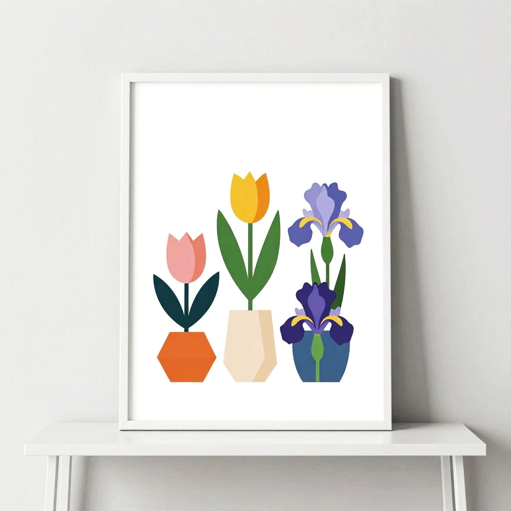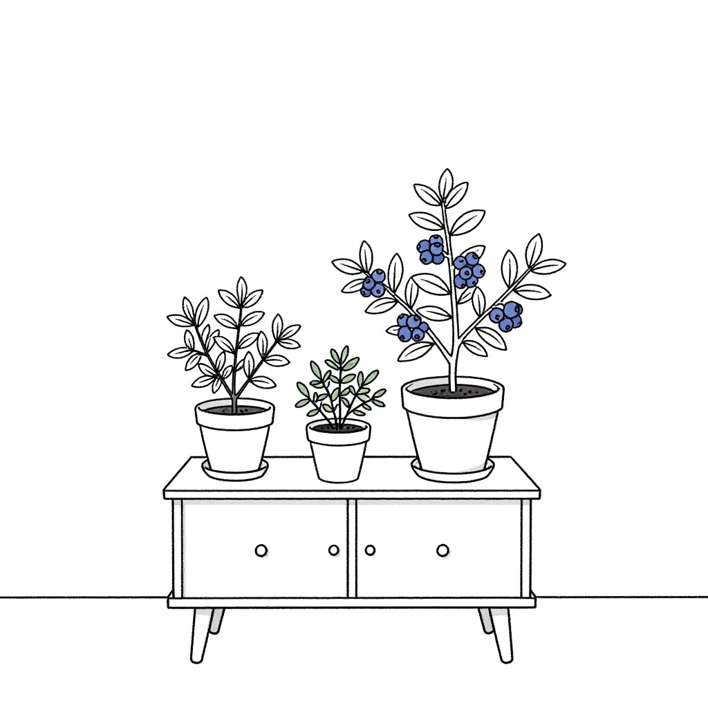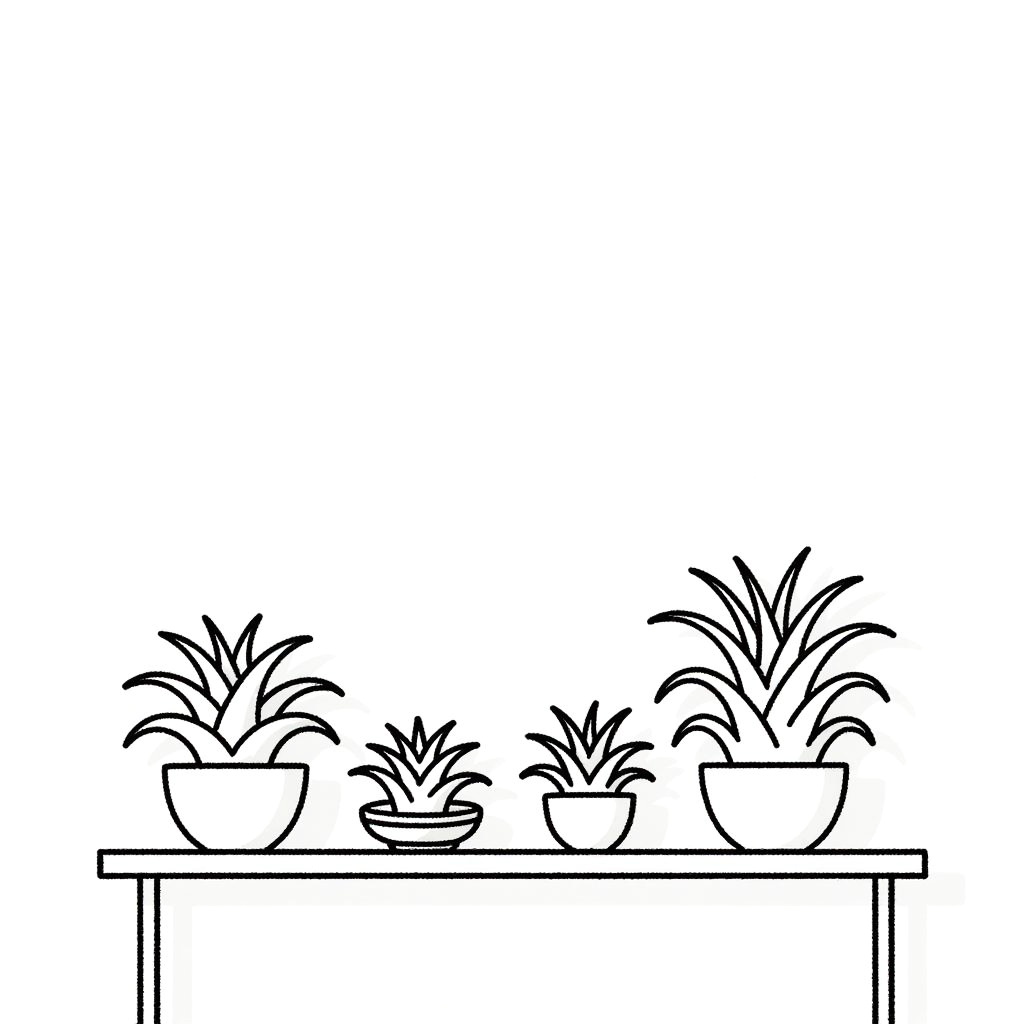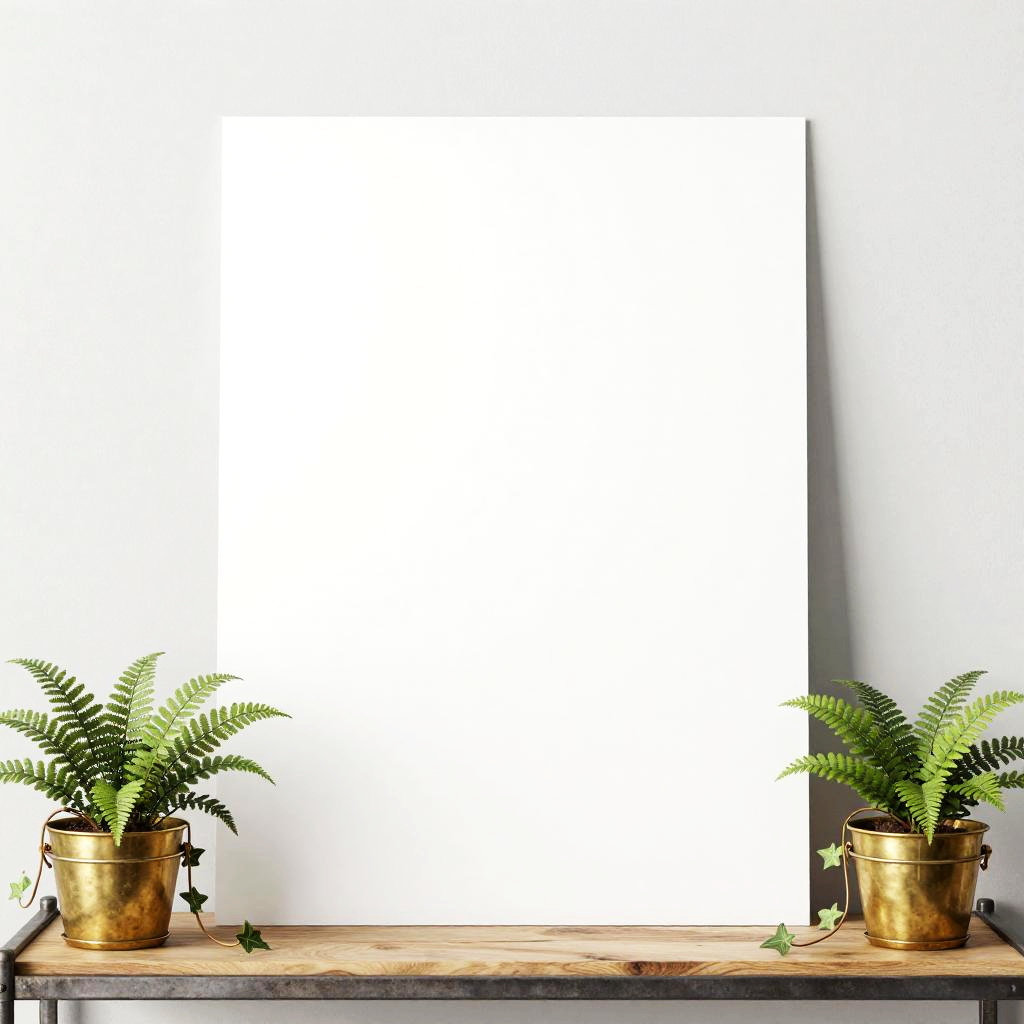 Minimalist etched pen lines depiction of miniature ferns and ivy entwined around antique brass pots, arranged in industrial metal shelf with wooden planks. Clean composition with abundant negative space, crisp contours, subtle paper texture, restrained detail, monochrome or gentle two-tone palette, calm modern poster aesthetic, no background clutter.