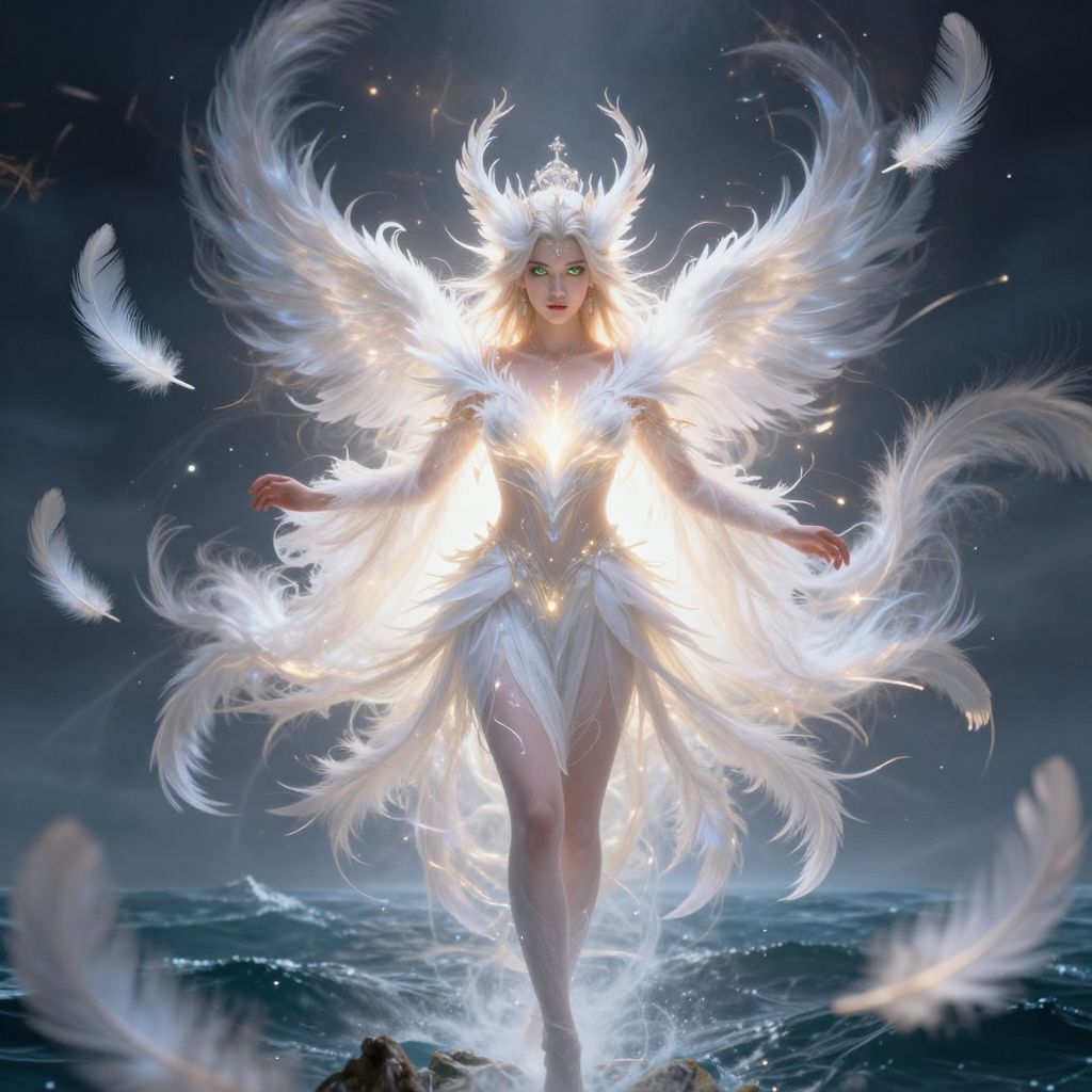 Digital artwork of a mystical, ethereal woman with glowing white wings and feathers, standing in a dark, stormy ocean. She has long, flowing blonde hair, pale skin, and wears a radiant, feathered outfit that shines brightly. Her wings are expansive, with feathers fanning out in all directions, illuminated by a celestial light. The ocean waves crash around her feet, adding a sense of movement. The background is a stormy night sky with dark clouds. The overall style is fantasy with a magical, otherworldly aesthetic.