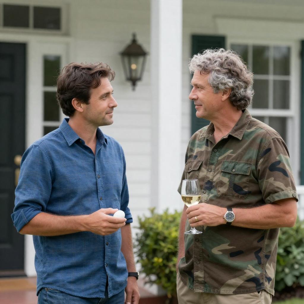 Photograph of five middle-aged men at a table, drinking wine. Two men with arms around shoulders, smiling. Third man leans forward, smiling. Fourth man, bald, in striped shirt, looks down. Fifth man, with receding hairline, smiles. Table with wine bottle, glasses, and ashtray. Warm lighting. Background includes framed picture and "SATELLITE" sign. Casual, relaxed atmosphere.