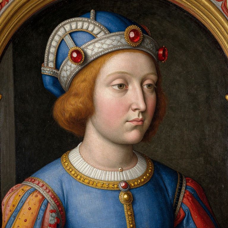This is a detailed, Renaissance-style oil painting of a fair-skinned woman with reddish-brown, shoulder-length hair. She wears a blue and silver crown adorned with red gemstones, and a blue dress with red and gold puffed sleeves. Her dress features a white, beaded collar and a gold, jeweled necklace. The background is dark, highlighting her pale face and composed expression. The painting is framed with a gold arch, adding a regal touch. The woman's delicate features and slightly melancholic gaze are accentuated by the soft, realistic rendering typical of the period.