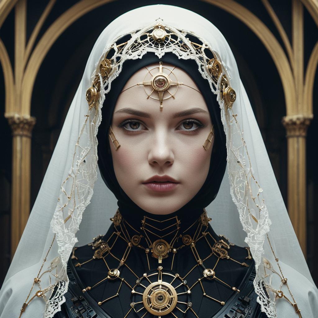 Ultradetailed portrait of a young woman with a cybernetic design wearing a black bodysuit adorned with intricate golden mechanical elements and a white embroidered lace chapel veil. The futuristic figure combines elements of humanoid robotics and classical veiling, set against a dark background with Gothic arches. The image features fine art style, mechanical robotic armor, and a highly detailed face, captured with a 35mm lens emphasizing golden ratio composition.