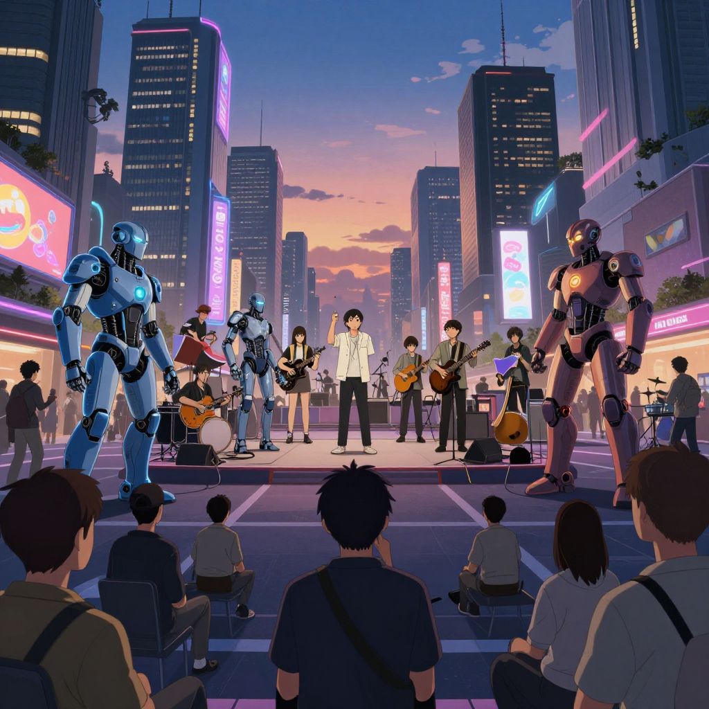 Digital artwork of a futuristic city concert featuring humanoid robots and humans playing instruments, with neon lights and skyscrapers in the background. Audience sits in the
