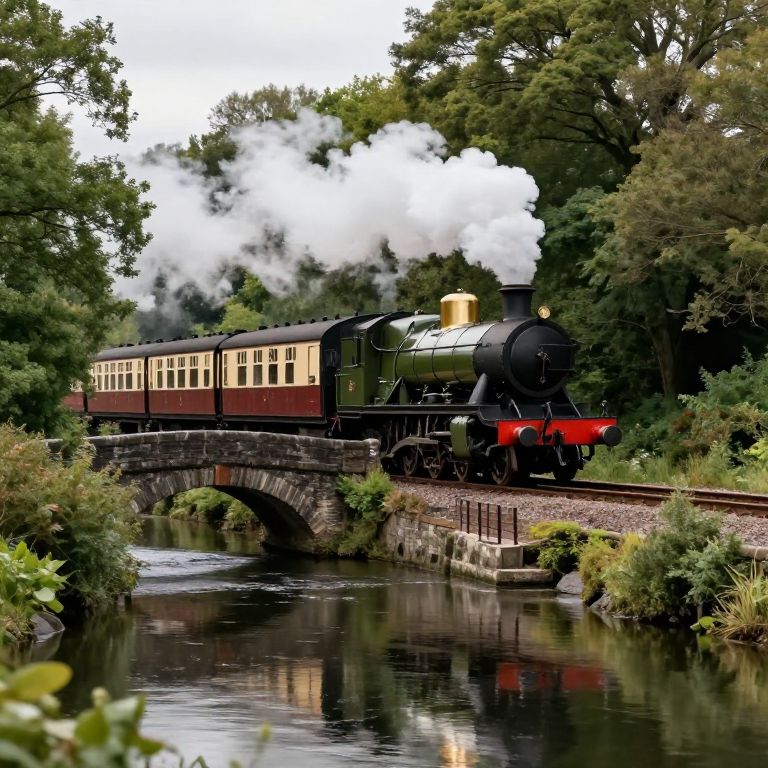 Photograph of a vintage steam locomotive with black and green exterior, emitting white smoke, traversing a stone arch bridge over a reflective river. The train consists of maroon and cream passenger cars. Lush green trees frame the background, with sunlight filtering through. The foreground includes grassy banks and shrubs. The image captures a nostalgic, picturesque scene with vibrant colors and detailed textures of the train and natural surroundings.