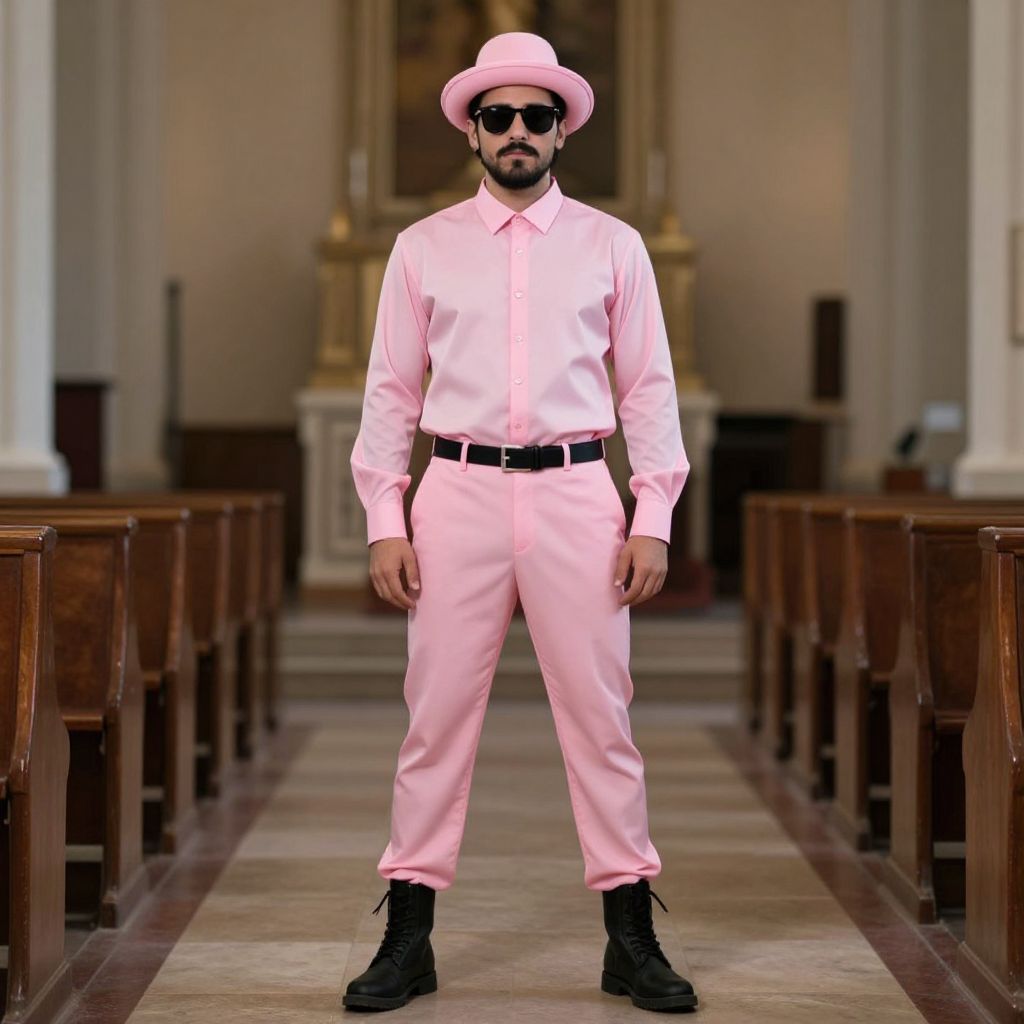 Photograph of a bearded man standing in a church aisle, centered in the frame. He wears a pink wide-brimmed hat, black sunglasses, a pink long-sleeve shirt, pink pants, and black boots. His hands rest by his sides and he has a black belt with a gold buckle. The background shows wooden pews on either side and a blurred golden religious artifact at the back. The floor is tiled with a brown and beige pattern. The overall style is bold and contemporary, with a strong contrast between the pink outfit and the traditional church setting.