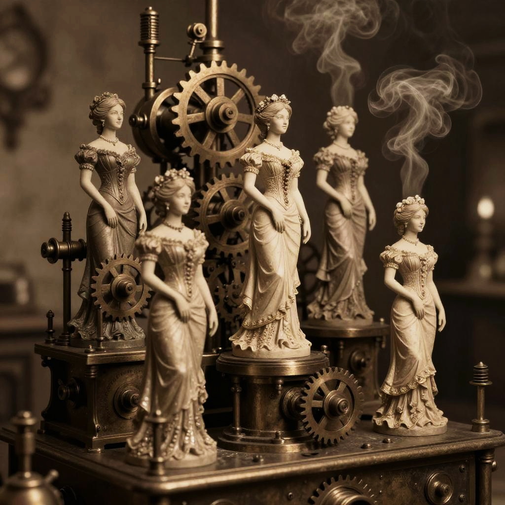 Women generator in a steampunk setting, an intricate machine with gears and steam valves producing elegant Victorian-era women figures, warm sepia tones, atmospheric lighting with wisps of steam, detailed mechanical design, fantasy art