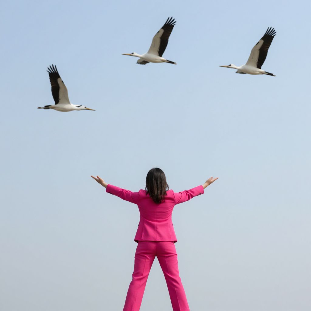 A woman in a vibrant pink outfit stands with arms outstretched beneath a trio of cranes soaring gracefully in formation, creating a surreal dance between human aspiration and avian flight against a vast, open sky.