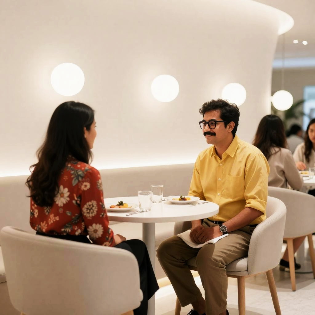 Photograph of a modern, curved, white-lit restaurant. Man with mustache, glasses, yellow shirt, brown pants, and white napkin, sitting across from woman with long dark hair, red floral blouse, black skirt. Round white table with glasses and plates between them. Soft, round lamps illuminate the background. Other patrons in the background. Man smiles, woman looks at him. Modern, stylish setting.