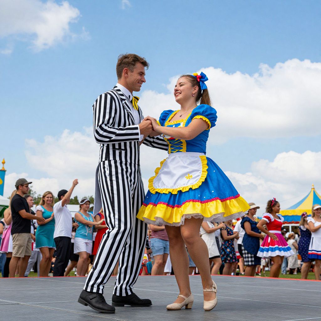 Photograph of a lively outdoor scene featuring a couple dancing. The man, with curly brown hair, wears a black and white striped suit, and the woman, with blonde hair in a blue bow, dons a vibrant blue and yellow dress with a white apron and puffed sleeves. They hold hands and smile at each other. The background shows a clear blue sky with scattered clouds, a crowd of onlookers, and colorful tents. The woman's dress has yellow and blue ruffles, and she wears beige ballet shoes. The crowd, dressed in casual summer attire, watches intently. The image is brightly colored and captures a joyful, festive atmosphere.