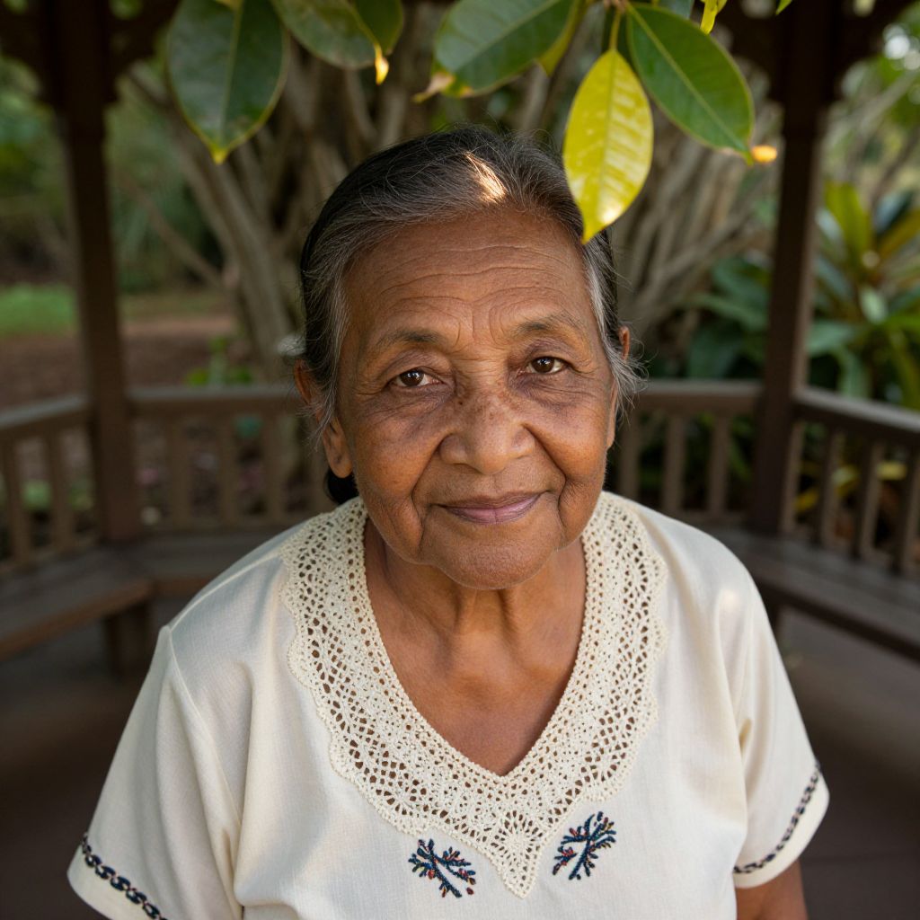 A photorealistic portrait captures an elderly Melanesian woman's wisdom and grace from a bird's-eye view within her antique garden gazebo. Her crinkled eyes and gentle smile exude serenity as soft light filters through the leaves above, casting a warm glow on her face and highlighting the intricate lace collar around her neck. Dressed in simple yet elegant clothing adorned with delicate embroidery, each stitch reflects her life experiences. This enchanting image evokes feelings of warmth, nostalgia, and resilience, inviting viewers to connect with her story through her expressive eyes and serene demeanor.