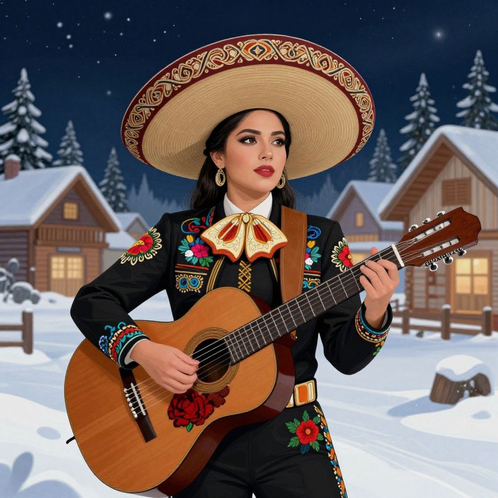 Digital illustration of a Latina woman in traditional Mexican attire, playing an acoustic guitar under a starry winter night sky.