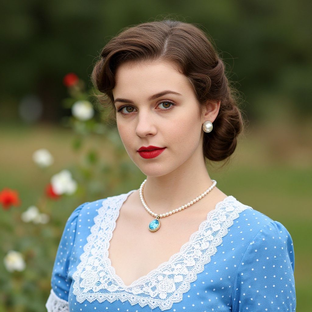 Photograph of a young woman with fair skin and dark brown, wavy hair styled in vintage curls, reminiscent of the 1950s. She has brown eyes, light pink lipstick, and subtle pink blush. She wears a white, floral-patterned blouse. The background features a light cream wall with pink floral wallpaper and a turquoise tufted sofa. The image has a soft, nostalgic feel, emphasizing a classic, retro aesthetic. The woman is positioned slightly to the right, facing the camera with a gentle smile.