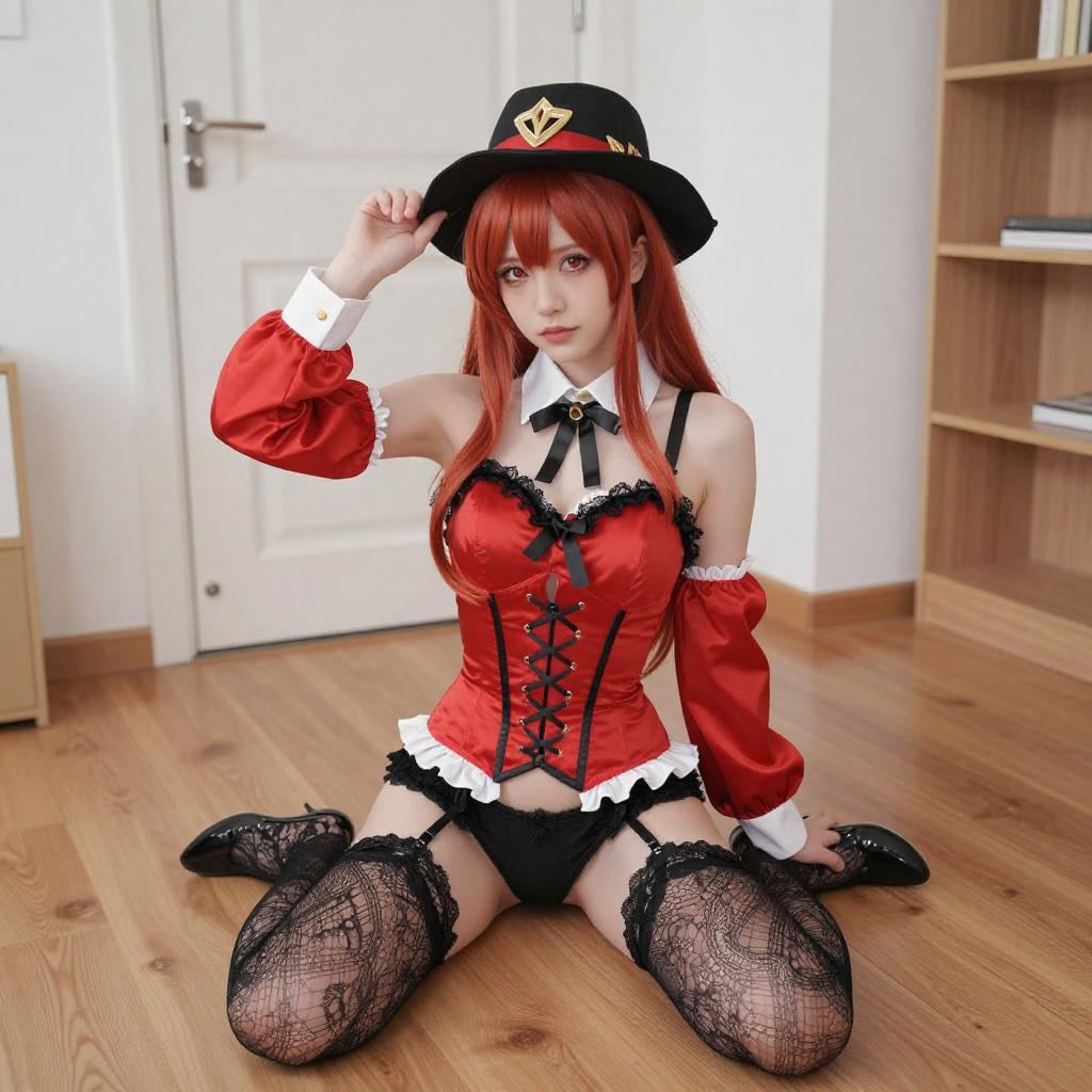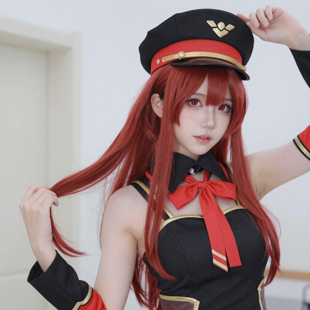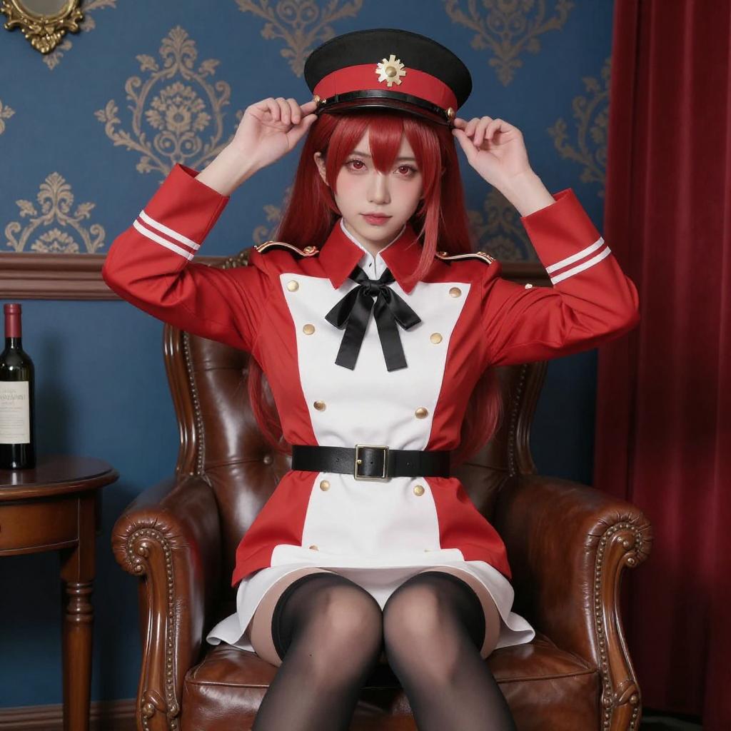 Photograph of a young woman with long black hair and red eyes, wearing a red and black military-style cosplay outfit with yellow accents, a large black hat with red and yellow details, and white thigh-high stockings. She is kneeling indoors, with wooden cabinets and a black curtain in the background. Her expression is slightly playful, and she is adjusting her hat with her right hand.