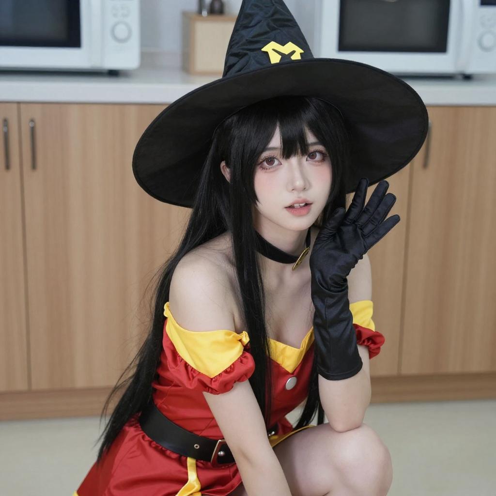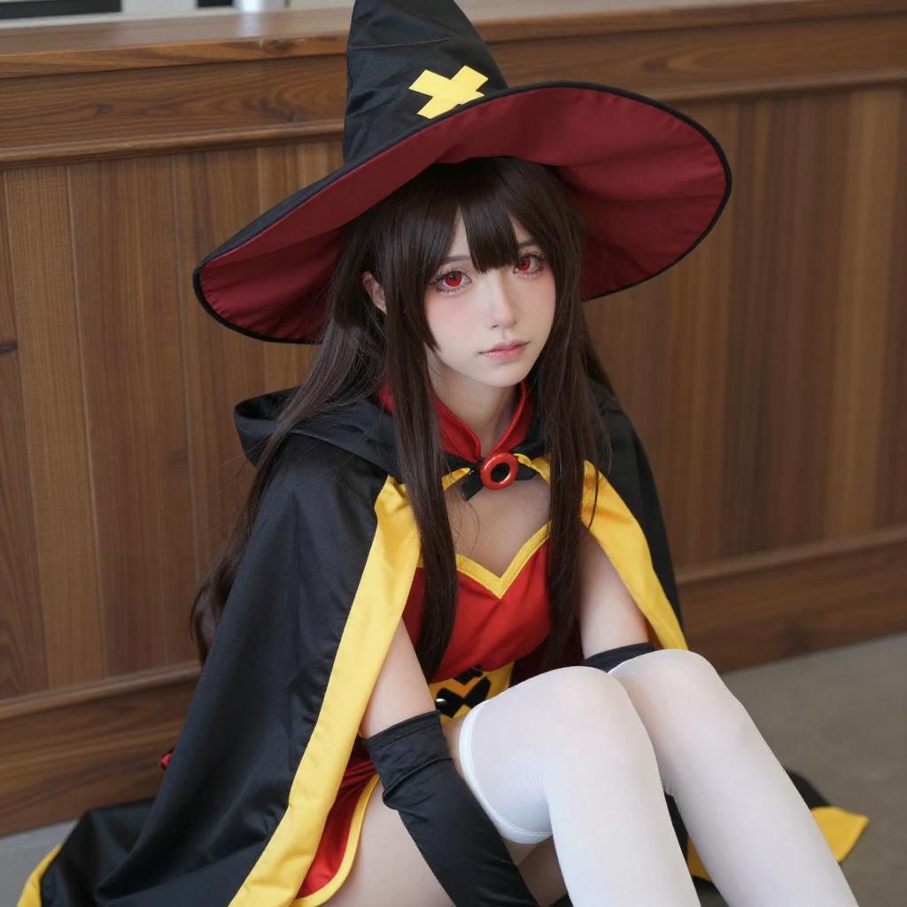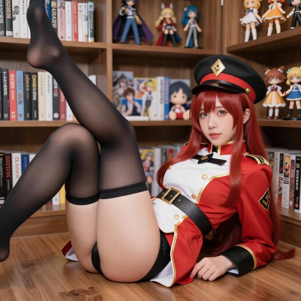 Photograph of a young woman with long black hair and red eyes, wearing a red and black military-style cosplay outfit with yellow accents, a large black hat with red and yellow details, and white thigh-high stockings. She is kneeling indoors, with wooden cabinets and a black curtain in the background. Her expression is slightly playful, and she is adjusting her hat with her right hand.