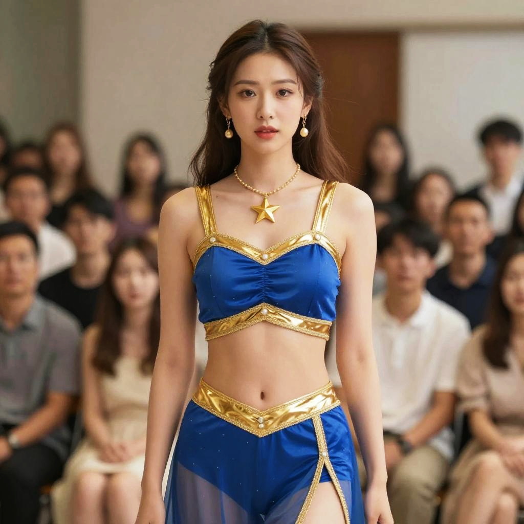 Bright Star, a woman in a blue and gold costume standing in front of a crowd